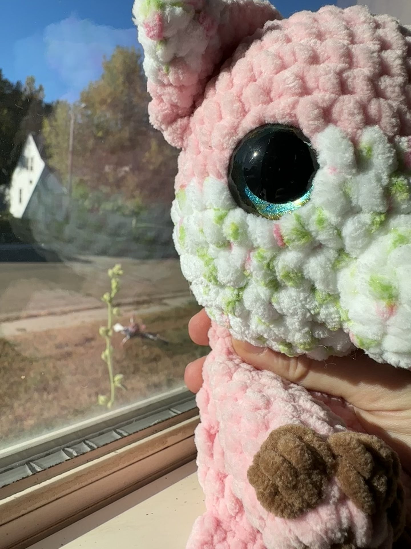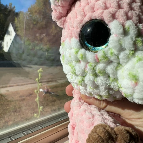 Beautiful Pink Floral Fox snuggler. Handmade with love in Montana with chenille yarn and bespoke eyes.